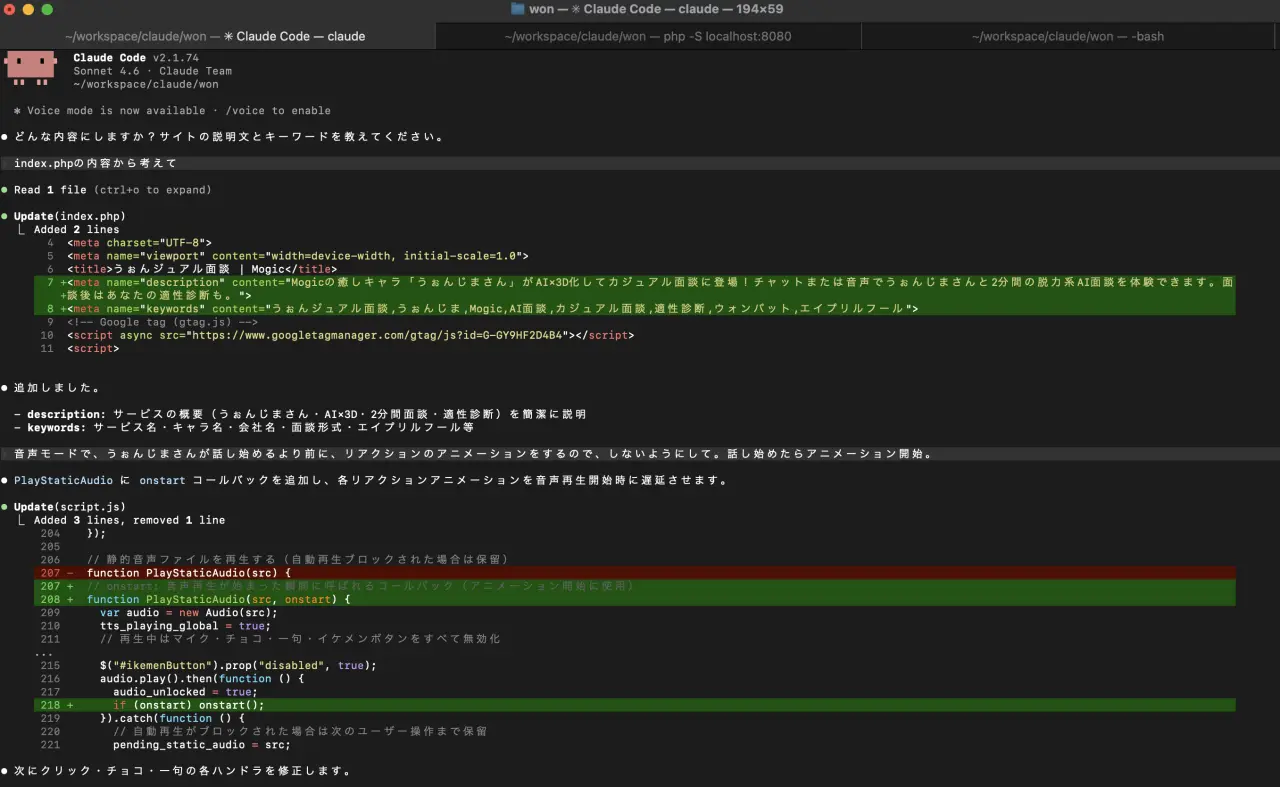 一般的なAI面接ではユーザーは質問・評価される側ですが、うぉんジュアルでは面接なのかよく分かんないようなゆるいおしゃべりを目指しました。開発は今回もClaude Codeを使っての1人開発、通称ワンテックです。素材の生成では以下を使いました。
